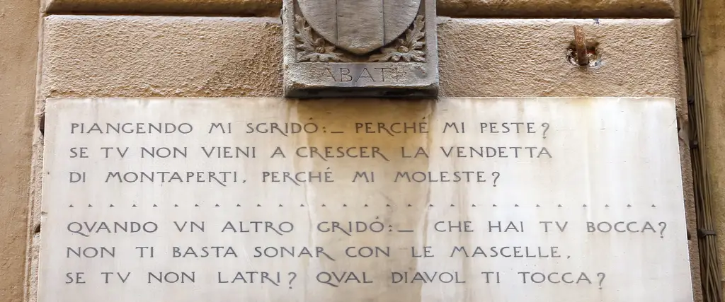 PIANGENDO MI SGRIDÒ: “PERCHÉ MI PESTE? SE TU NON VIENI A CRESCER LA VENDETTA DI MONTAPERTI, PERCHÉ MI MOLESTE? ...UN ALTRO GRIDÒ: “CHE HAI TU, BOCCA? NON TI BASTA SONAR CON LE MASCELLE, SE TU NON LATRI? QUAL DIAVOL TI TOCCA?”