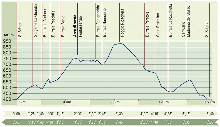The walking route features 16 km of elevation profile surrounded by greenery and has a total altitude difference close to 950 m.