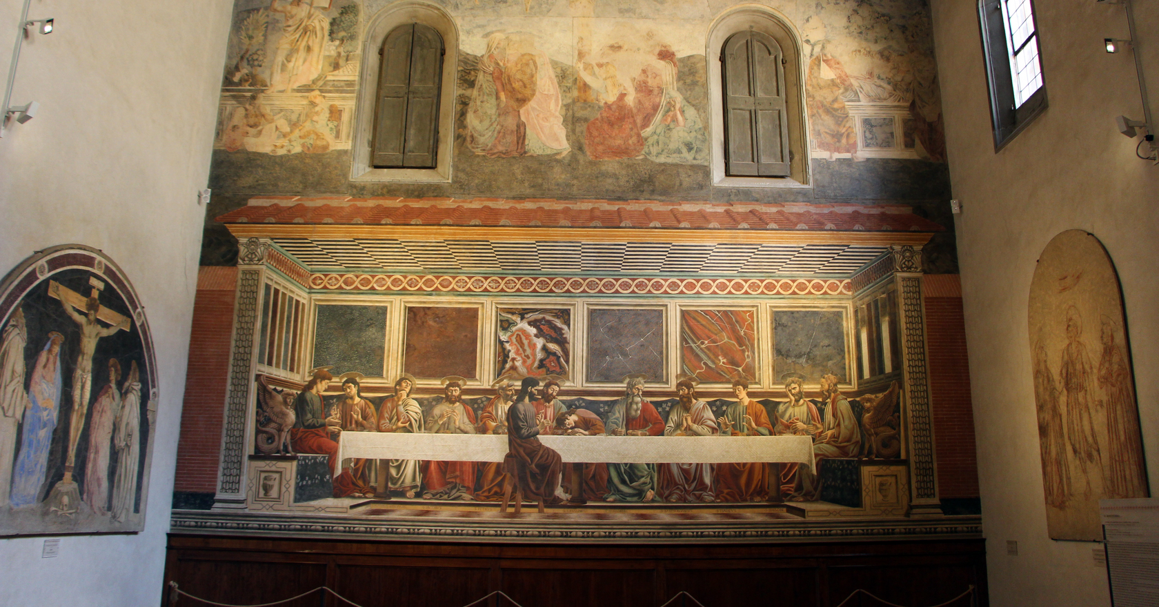 On the end wall of the refectory is a fresco of the Last Supper by Andrea del Castagno and, above, a Resurrection, a Crucifixion and a Deposition dating to 1447.