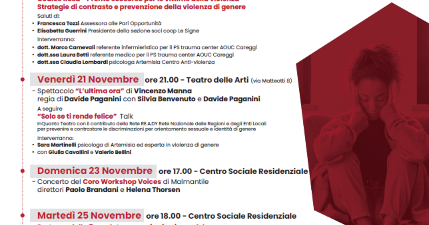 Dal 20 al 28 novembre 2025 dibattiti, incontri, mostre, spettacoli teatrali: questo e molto altro nel programma di iniziative promosso dal Comune di Lastra a Signa e dalle associazioni del territorio in occasione della Giornata internazionale per l’eliminazione della violenza contro le donne.