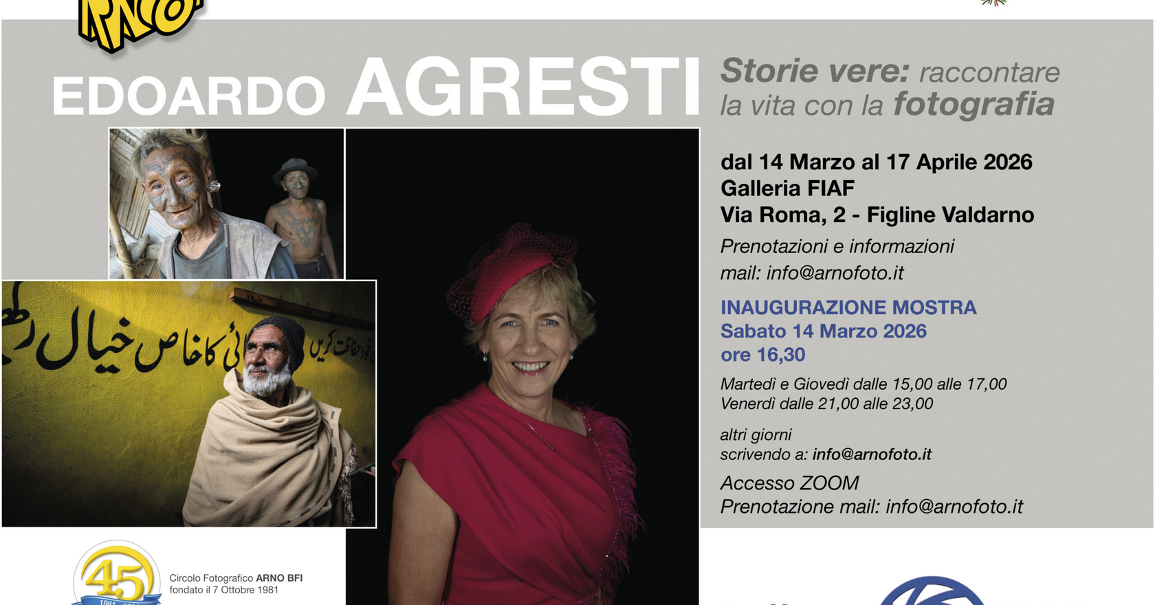 L'inaugurazione della mostra fotografica di Edoardo Agresti "Storie vere: raccontare la vita con la fotografia" si terrà alla Galleria FIAF del Circolo fotografico Arno in via Roma 2 a Figline alle ore 16:30. La mostra proseguirà poi nei giorni martedì e giovedì dalle ore 15 alle ore 17 e venerdì dalle ore 21 alle ore 23, fino al 17 Aprile 2026.