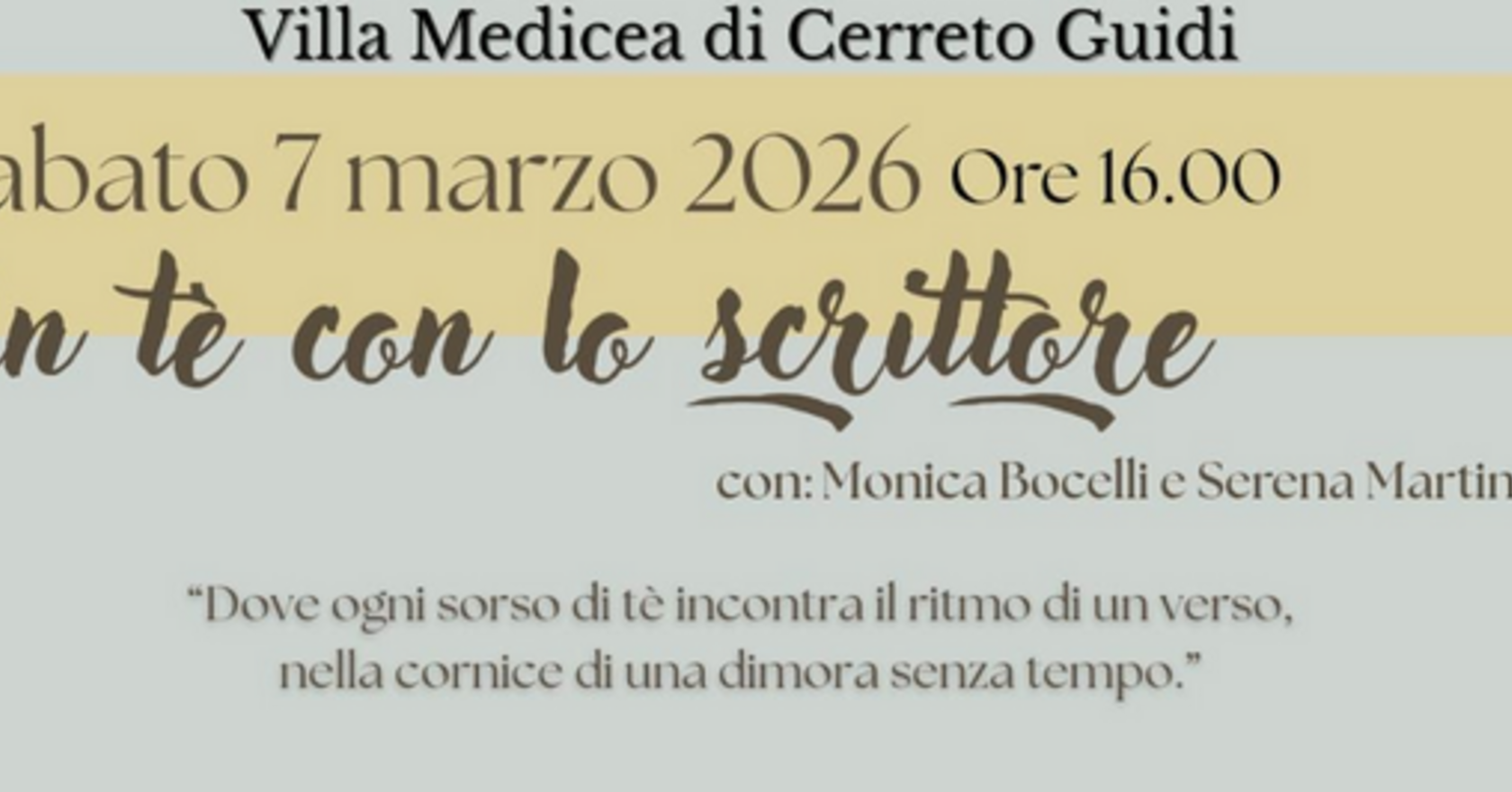 Aggiungi ai preferitiAggiungi alla brochure HomeEventiUn tè con lo scrittore a Cerreto Guidi Un tè con lo scrittore a Cerreto Guidi Readings, Conferenze, ConvegniSabato 7 Marzo 2026 torna alla Villa Medicea di Cerreto Guidi l'appuntamento con "Un tè con lo scrittore" con Monica Bocelli e Serena Martinelli per un pomeriggio dedicato alla Poesia.L'ingresso è gratuito con prenotazione graditaCrediti fotograficiVilla Medicea di Cerreto Guidi Informazioni rapide ComuniCerreto GuidiSito webPagina Facebook della Villa Medicea di Cerreto GuidiTelefono+39 0571 55707 Appuntamenti Aggiungi ai preferitiAggiungi alla brochure Informazioni rapide ComuniCerreto GuidiSito webPagina Facebook della Villa Medicea di Cerreto GuidiTelefono+39 0571 55707 Navigazione rapida Appuntamenti Un tè con lo scrittoreQuando07/03/2026dalle 16:00PrezziDoveVilla Medicea di Cerreto Guidi